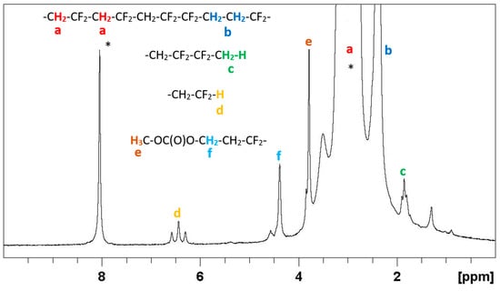 - Ameduri, B.; Ladaviere, C.; Delolme, F.; Boutevin, B. First MALDI-TOF Mass Spectrometry of Vinylidene Fluoride Telomers Endowed with Low Defect Chaining. Macromolecules 2004, 37, 7602–7609. [Google Scholar] [CrossRef]