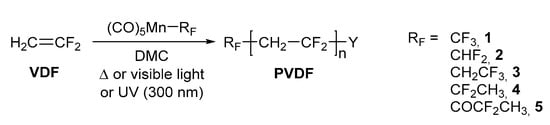 - Asandei, A.D.; Adebolu, O.I.; Simpson, C.P. Mild-Temperature Mn2(CO)10-Photomediated Controlled Radical Polymerization of Vinylidene Fluoride and Synthesis of Well-Defined Poly(vinylidene fluoride) Block Copolymers. J. Am. Chem. Soc. 2012, 134, 6080–6083. [Google Scholar] [CrossRef]
