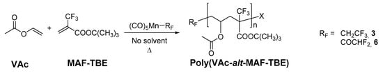 - Banerjee, S.; Ladmiral, V.; Totée, C.; Améduri, B. Alternating radical copolymerization of vinyl acetate and tert-butyl-2-trifluoromethacrylate. Eur. Polym. J. 2018, 104, 164–169. [Google Scholar] [CrossRef]
