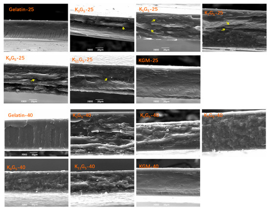 In Figure 1, the SEM graphs present the fracture surfaces of KGM and gelatin films and their composite films prepared under different drying (film-forming) temperatures (25 and 40 °C). For the KGM and gelatin films, a smooth and compact fracture surface could be seen, indicative of a continuous structure matrix of the films (ternary gelatin/konjac glucomannan/glycerol system) on the micron scale. For the KGM/gelatin composite films, the drying conditions at 25 °C led to several notable cracks randomly distributed in the film matrix; a higher drying temperature at 40 °C somewhat eliminated such cracks, giving a relatively compact fracture structure matrix.