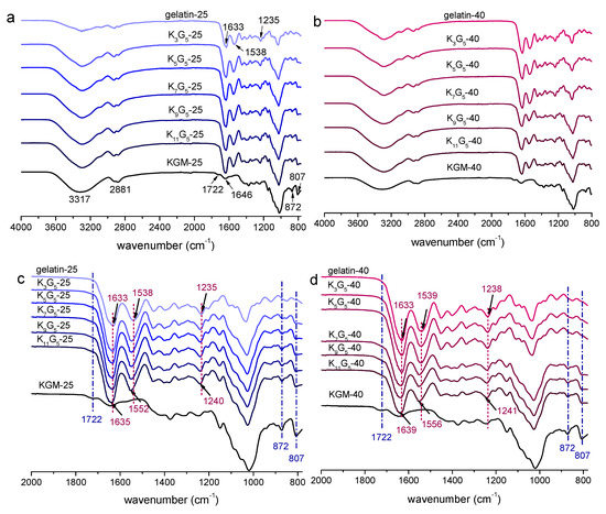 ATR-FTIR spectra of KGM, gelatin, and KGM/gelatin films formed under drying temperature of 25 (full (a); enlarged (c)) or 40 °C (full (b); enlarged (d)).