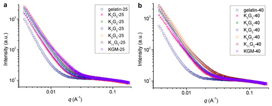 SAXS patterns of KGM, gelatin, and KGM/gelatin films formed at drying temperatures of 25 (a) or 40 °C (b).
