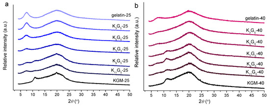 XRD patterns of KGM, gelatin, and KGM/gelatin films formed at drying temperatures of 25 (a) or 40 °C (b).
