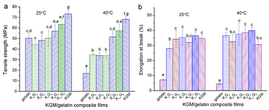 Tensile strength (σt) and elongation at break () for KGM, gelatin, and KGM/gelatin films prepared with drying temperatures of 25 °C (a) and 40 °C (b). Values with the different lowercase letters letter in each figure differ significantly at p < 0.05.