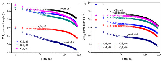 Variations in CH2I2 contact angle with time for KGM, gelatin, and KGM/gelatin films prepared under drying temperatures of 25 °C (a) and 40 °C (b).