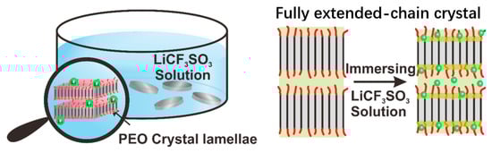 All the chemical reagents were purchased from Sigma-Aldrich (Sigma-Aldrich Inc., St. Louis, MO, USA). The polyethylene oxide (PEO) had a molecular weight (Mw) of 1500. Previous studies showed that such a low molecular weight PEO generally forms crystals with a fully-extended chain, i.e., the fully extended-chain crystals [,,,]. To prepare these samples, PEO powders were first pressed to form flakes with a diameter of 0.75 cm and a thickness of 200 μm. The flakes were then immersed in the LiCF3SO3 pentyl acetate solution. PEO has a very low solubility in LiCF3SO3 pentyl acetate solution, and the flakes do not dissolve. However, during the immersion process, Li+ ions may interact with the polymer chains on the PEO crystal surface. The Li+ ions can gradually diffuse into the crystal surface and gradually penetrate the crystal because of the coordination interactions between Li+ ions and oxygen atoms of PEO chain. This leads to a decrease in the lamellar thickness (Figure 1). We prepared three samples with different immersion times (105, 240, 390 min); these samples were named IM105-PEO/Li+, IM240-PEO/Li+, and IM390-PEO/Li+, respectively. After immersion, the samples were dried under vacuum at 313 K for 5 days to remove the solvent. We then used 7Li solid-state NMR to measure the Li+ contents in the samples (see Figure S1). We calculated the ratios of Li+/EO in these samples based on the Li+ contents (Table 1).