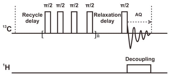 We designed a unique pulse sequence for 13C single pulse excitation NMR to monitor the 13C amorphous signals. This sequence used a very short relaxation delay to recover the desired amorphous signals selectively (see Figure 2). The train of the π/2 pulses saturated the signals recovered during the recycling delay. The following relaxation delay was then used to recover the desired signals selectively with a very fast T1 relaxation (spin lattice relaxation). The relaxation delay was set to 0.05 s to select the mobile amorphous signals.