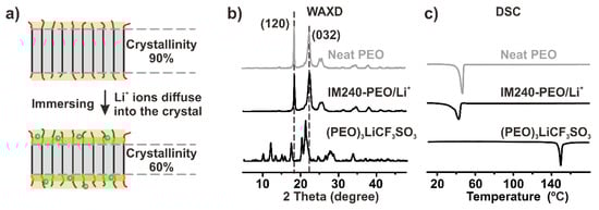Figure 3b shows the WAXD patterns of the neat PEO, IM240-PEO/Li+, and (PEO)3LiCF3SO3. In the WAXD pattern of PEO, the peaks at 2θ = 19.16° and 23.33° were the characteristic reflection peaks of the PEO crystal; they could be assigned to the crystallographic planes of (120) and (032), respectively. The WAXD patterns of IM240-PEO/Li+ showed very similar diffraction peaks, indicating that the dominant crystal structure in IM240-PEO/Li+ was the PEO crystals. The diffraction peaks of the (PEO)3LiCF3SO3 complex crystal were missing in the pattern, indicating that the PEO/Li+ complexes were completely amorphous. The presence of the PEO crystal and the missing (PEO)3LiCF3SO3 complex crystals in IM240-PEO/Li+ were further confirmed by the DSC measurements of the sample (see Figure 3c) []. Low molecular weight PEOs, like the PEO sample (Mw = 1500) used here, are prone to forming fully extended chain crystals [,,]. In this sample morphology, Li+ ions will first interact with the non-crystalline structures on the crystal surface when the crystals are immersed into a solvent. With increasing immersion time, the Li+ ions can be enriched on the surface and, in turn, even diffuse into the PEO crystalline, resulting in reduced crystallinity (Figure 3a).