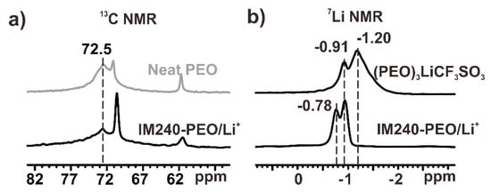 (a) The 13C NMR spectra of neat PEO and IM240-PEO/Li+. (b) The 7Li NMR spectra of (PEO)3LiCF3SO3 and IM240-PEO/Li+. The temperature in the NMR experiments was 300 K.