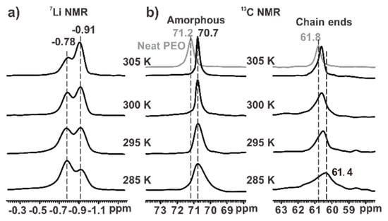 These observations helped explain the origin of the 7Li signals at −0.78 ppm in Figure 5a. The signals at −0.78 ppm in the 7Li spectra showed a clear decrease with increasing temperature, thus indicating the decreasing amount of Li+ species. Meanwhile, the 13C NMR in Figure 5b showed that the chain ends had a clear downfield shift towards the 13C chemical shift value of neat amorphous PEO with increasing temperature. This suggested that the PEO chain ends in IM240-PEO/Li+ formed conformational structures close to those in neat amorphous PEO with increasing temperature. The coordination structures between Li+ ions and the chain ends in IM240-PEO/Li+ became loose or even dissociated with increasing temperature. This change agreed with the Li+ (−0.78 ppm) data in 7Li NMR: The Li+ species (−0.78 ppm) were strongly associated with the chain ends.