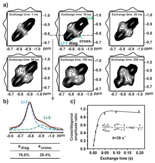 Next, 2D 7Li–7Li exchange NMR was used to probe the local exchange dynamics between the Li+ ions coordinated with PEO segments (−0.91 ppm) and the Li+ ions coordinated with the PEO chain ends (−0.78 ppm). Figure 6a shows the 2D 7Li–7Li exchange spectrum acquired using the exchange time varying from 1 to 200 ms. The experimental temperature was 305 K. Clear cross-peaks were observed in the spectrum, indicating the presence of the exchange dynamics between the two Li+ species. To quantify the exchange rate, a two site exchange (e.g., Li-1 ↔ Li-2) was introduced to model the process []. Based on this model, the exchange rate, k, could be calculated from the ratio between the cross-peak intensity and the diagonal peak intensity: