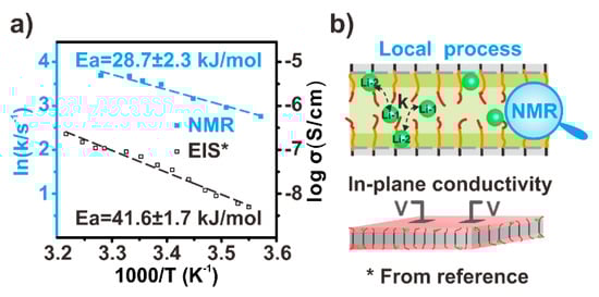 Figure 7a gives the Arrhenius plots of the exchange rates. The fitting yielded an activation energy of 28.7 ± 2.3 kJ/mol. This activation energy value was much lower than the PEO/Li+ complex crystals [] and even the amorphous PEO/Li+ complexes [], thus indicating very weak coordination between the Li+ ions and the ligands (i.e., the PEO chain segments and the chain ends). This weak coordination could be associated with the high mobility of the amorphous chain segments in the sample, especially the high mobility of the chain ends. We tried to determine the connection between this exchange process and ionic conductivity in this study.