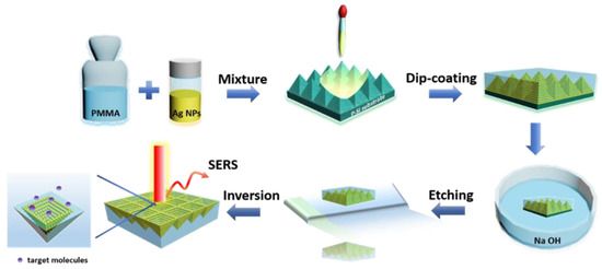 Schematic illustration of the fabrication process for the P–AgNPs @PMMA substrate.