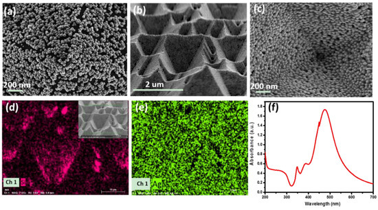 To investigate the structural properties of the P–AgNPs@PMMA composite substrates, we performed SEM characterization (Figure 2). AgNPs were deposited on the surface of the P-Si substrate via dip-coating, as shown in Figure 2a. The inclined surface of the periodic pyramid-shaped structures could facilitate the aggregation of probe molecules and create high-density 3D “hot spots”, which is critical for the final enhancement activity. Figure 2b,c, respectively exhibit low- and high-magnification SEM images of the P–AgNPs@PMMA flexible substrate after removal of the P-Si substrate. As pictured in Figure S1 (from the Supplementary Materials), the average size of these AgNPs is ∼78nm, and the gaps among nanoparticles are very narrow, which supports huge electromagnetic enhancement for absorbed molecules. The composition of the P–AgNPs @ PMMA flexible substrate is also analyzed with high-resolution EDS mapping in Figure 2d,e, indicating that high-density AgNPs were successfully embedded within the PMMA film. Figure 2f shows a strong UV-vis absorption peak at ~476 nm of AgNPs, which is attributed to the strong coupling of the plasma between the AgNPs. Thus, a high signal-to-noise ratio SERS signal can be generated at 532 nm incident excitation light.