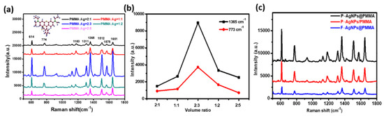 (a) The surface-enhanced Raman scattering (SERS) spectra obtained from the P–AgNPs@PMMA substrate with different PMMA/Ag volume ratio; here, the concentration of rhodamine 6G (R6G) is 10−7 M. Insert: the structural formula of R6G molecule; (b) change in Raman intensity of R6G at 774 and 1365 cm−1 as a function of volume ratio; (c) SERS spectra of 10−7 M R6G absorbed on the P–AgNPs@PMMA (black line), P–AgNPs/PMMA (red line) and F–AgNPs@PMMA (blue line) substrates.