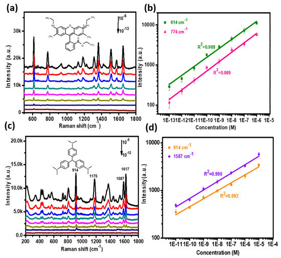 (a) Raman spectra of R6G from 10−6 to 10−13 M on the P–AgNPs@PMMA substrate. Insert: the structural formula of R6G molecule; (b) the Raman spectra of R6G at 614 and 774 cm−1 as a function of the molecular concentration on the P–AgNPs@PMMA substrate in log scale; (c) Raman spectra of CV with concentration from 10−5 to 10−12 M on the P–AgNPs@PMMA substrate. Insert: the structural formula of CV molecule; (d) the Raman spectra of CV at 914 cm−1 and 1567 cm−1 as a function of the molecular concentration on the P–AgNPs@PMMA substrate in log scale.