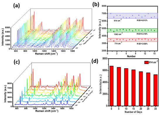 (a) Raman spectra collected from different points on the P–AgNPs@PMMA substrate for R6G molecules. The R6G concentration is measured at 10−7 M; (b) the peaks at 614, 774, and 1362 cm−1 demonstrate relative intensities collected from the Raman spectra; (c) the Raman spectra of the P–AgNPs@PMMA substrate was measured every five days at room temperature; (d) the Raman intensity of the 614 cm−1 peaks for R6G from (c).