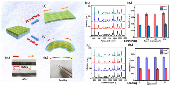 Durability tests with mechanical stimuli of the P–AgNPs@PMMA substrate. Schematic illustration: comparative Raman spectra and the SERS intensity of R6G at 614 and 774 cm−1 peaks; (a) after stretching the P–AgNPs@PMMA substrate to ~10%, 20%, 30%; (b) after the bending the P–AgNPs@PMMA substrate in half; (a1) the optical image of stretching; (b1) the optical image of bending; (a2) raman signals of stretching; (b2) raman signals of bending; (a3) histograms for the stretching; (b3) histograms for the bending.