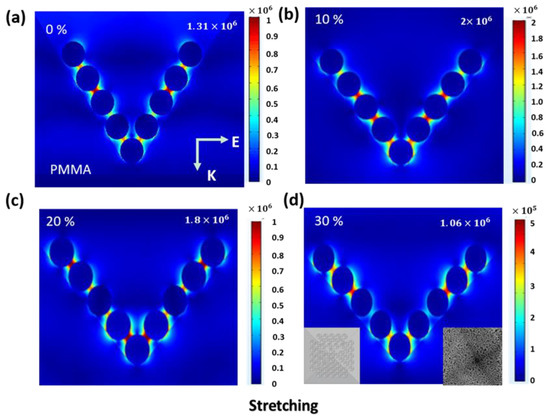 The respective Y–Z views of the electric filed distributed on the P–AgNPs@PMMA substrate after stretching to ~0% (a), 10% (b), 20% (c), and 30% (d).