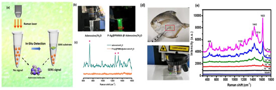 (a) Schematic illustration showing the in-situ detection process of the adenosine solution; (b) the optical picture of the in-situ detection of adenosine molecules; (c) Raman spectra of adenosine molecules before (orange line) and after (green line) placing the P–AgNPs@PMMA substrate on the adenosine solution to confirm the SERS effect. Insert: in-situ detection of adenosine molecule; (d) the optical picture of detecting of methylene-blue (MB) by swabbing the marine fish surface; (e) SERS spectra of MB obtained by swabbing fingerprint on the marine fish surface.