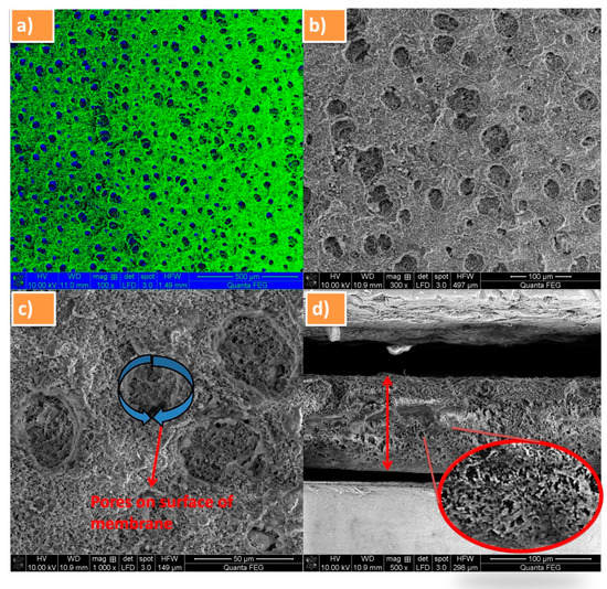 FE-SEM images of PVdF-SiO2 membrane (a) color overlaid SEM image, the blue and green colors indicate the pores and surface of membrane, respectively; (b) separator at 300× magnification; (c) visible pores on the membrane surface; and (d) cross-sectional FE-SEM view of membrane with enlarged area view.