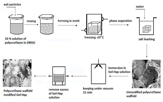 The PUR scaffolds were prepared using a 30% solution of polyurethane in DMSO. The process of scaffolds fabrication was based on solvent casting/particulate leaching method and is presented in Figure 1. At the first step, PUR was dissolved completely in DMSO at 85 °C. Then, salt (NaCl) with a diameter fraction in the range of 200–500 µm was added to a mixture and stirred to obtain the consistency of a paste. In the next step, paste consisting of PUR, DMSO, and NaCl was transferred into cubic molds (dimensions: 1 cm × 1 cm × 1 cm) and frozen to −20 °C. After 72 h, the obtained constructs were rinsed with deionized water to complete the removal of salt particles.