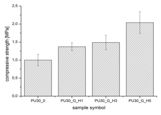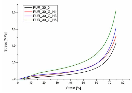 Compression stress–strain curves for PUR30_0, PUR30_G_H1, PUR30_G_H3, and PUR30_G_H5.