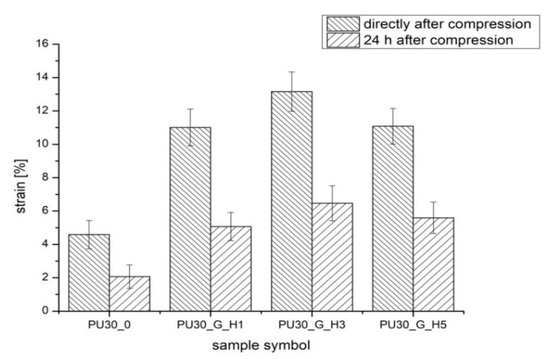 The strain (Figure 4) directly after compression (ε1) of modified PUR scaffolds after modification significantly increased from 4.59 ± 0.85% (PUR30_0) to 11.08 ± 1.07% (PUR30_G_H5) (α = 0.05). Two-way ANOVA tests confirmed that after 24 h, the value of strain (ε2) was significantly lower in comparison to strain directly after compression for all the samples (α = 0.05). For instance, the strain after the compression of PUR30_G_H3 was 13.16 ± 1.18%, while after 24 h, the value significantly decreased to 6.47 ± 1.05% (α = 0.05).