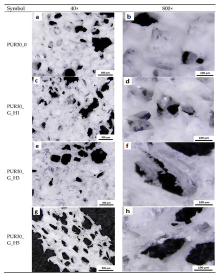 It was observed that obtained unmodified and modified PUR scaffolds included both types of pores: open and close macropores with size in the range of 100–500 μm and also smaller micropores with dimensions ranging from 1 μm to 100 μm (Figure 5 and Figure 6). PUR30_G_H5 had the highest content of pores in the range of 150–500 um (47.14%), which is proper for bone tissue regeneration. PUR30_0, PUR30_G_H1, and PUR30_G_H3 contained 43.55%, 17.09%, and 16.99% of pores in the range of 150–500 µm, respectively. It was observed that modification with Gel/HAp solutions caused significant changes of the scaffold’s structure. The Gel and particles of HAp are visible on presented images. However, it is noticeable that the solidified Gel clogs the pores space to some extent and functions as a filler of porous constructs [37]. It is confirmed by the results of porosity of the scaffolds, whose value of pores decreased from 67% to 50% (Table 2). The porosity of the unmodified scaffolds (PUR30_0) was equal to 67%. The value decreased for the samples immersed in Gel–HAp solution. For PUR30_G_H5, the porosity was equal to only 50%. A one-way ANOVA test confirmed that for PUR30_0 and PUR30_G_H5, the values of porosity are statistically different (α = 0.05). However, for PUR30_G_H1 (60%) and PUR30_G_H3 (59.5%), the porosity parameters are not significantly different (α = 0.05).