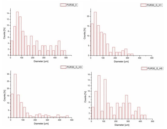 Pore size distributions for PUR30_0, PUR30_G_H1, PUR30_G_H3, and PUR30_G_H5.
