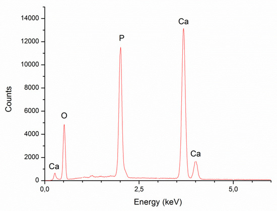 The weight and atomic composition of hydroxyapatite is shown in Table 3. The results correspond to the EDX spectra featured in Figure 8. The atomic content of oxygen, phosphorus, and calcium was equal 65.81 ± 1.78%, 13.64 ± 1.75%, and 20.55 ± 0.41%, respectively. The Ca/P ratio is ranked at 1.52 ± 0.17.