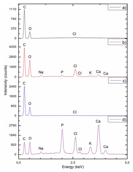 EDX spectra for (a,b) unmodified scaffolds before and after calcification, respectively; (c,d) scaffolds modified with gelatin and 5% HAp before and after calcification, respectively.