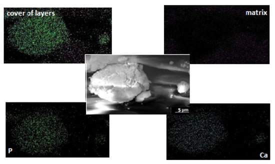 Figure 10 presents the distribution of elements in the exemplary agglomerate of calcium phosphate deposited on the surface of PUR_G_H5 construct after calcification. Images were created using SEM in combination with EDX mapping. According to Figure 9, a homogeneous distribution of calcium and phosphorus atoms within the presented agglomerate of calcium phosphate has been demonstrated.