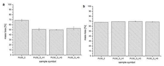 The results of mass loss of the samples are presented in the form of charts in the Figure 11a,b. The mass change of PUR_30_0 scaffolds was equal to 69.1 ± 2.3% and 68.1 ± 0.1% after a short-term degradation process in 5 M KOH and 2 M HCl, respectively. Two-way ANOVA evaluated that those mean values’ difference was not significant (α = 0.05). Whereas, after modification, the mass loss in 5 M KOH was significantly lower for all of the modified scaffolds in comparison to neat scaffolds (α = 0.05). For PUR_30_G_H1, PUR_30_G_H3, and PUR_30_G_H5, the values of mass loss were equal to 50.8 ± 1.8%, 50.3 ± 0.3%, and 52.9 ± 3.3%, respectively. In the case of the 2 M HCl medium, the results of mass loss for unmodified and modified scaffolds were very similar. As mentioned before, for PUR_30_0 constructs, the mass loss reached 68.1 ± 0.1%. In the case of PUR_30_G_H1, PUR_30_G_H3, and PUR_30_G_H5, the values were equal to 69.4 ± 0.1%, 69.9 ± 0.7%, and 68.9 ± 0.6%, respectively. A two-way ANOVA test confirmed that those values were statistically the same (α = 0.05).