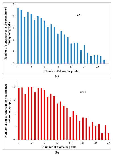 To initiate the simulation, we performed an analysis of the pore size distribution, observed in the binary images. The averages were different for each investigated structure (CS, CS-P, CS-GA, and CS-G) and equal to 24, 26, 36, 48 pixels, respectively. The void diameter distributions differed, displaying a (limited in range) power-law distribution of the diameter size (Figure 7). Such a power law dependency is critical in the analysis of the membrane transport parameters.
