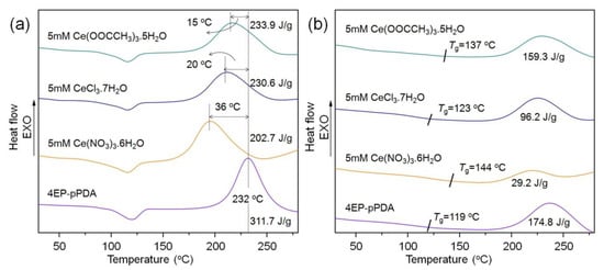 Differential scanning calorimetry (DSC) curves of 5 mM Ce(OOCCH3)3·5H2O, 5 mM CeCl3·7H2O, 5 mM Ce(NO3)3·6H2O, and 4EP-pPDA (a) before and(b) after curing at 150 °C for 4 h.
