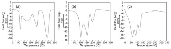 DSC curves of (a) Ce(NO3)3·6H2O, (b) CeCl3·7H2O, and (c) Ce(OOCCH3)3·5H2O.