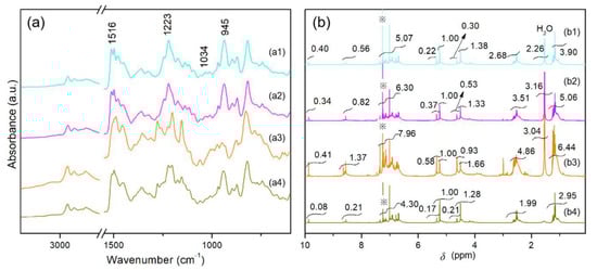 (a) FT-IR spectra and (b) 1H-NMR spectra of the 5mM Ce(OOCCH3)3·5H2O (a1, b1), 5mM CeCl3·7H2O (a2, b2), 5mM Ce(NO3)3·6H2O (a3, b3), and neat 4EP-pPDA (a4, b4) after curing at 150 °C for 1 h.