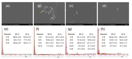 View of SEM images (first row) and EDX spectra (second row) of (a,e) 4EP-pPDA, (b,f) 5 mM Ce(NO3)3·6H2O, (c,g) 5 mM CeCl3·7H2O, and (d,h) 5 mM Ce(OOCCH3)3·5H2O after curing at 150 °C for 4 h.
