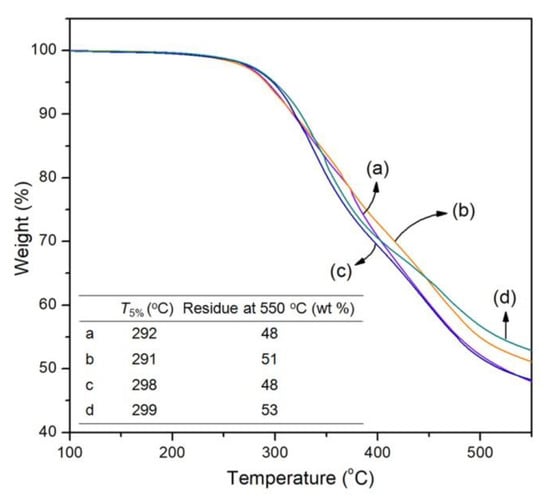 TGA curves of (a) 4EP-pPDA, (b) 5 mM Ce(NO3)3·6H2O, (c) 5 mM CeCl3·7H2O, and (d) 5 mM Ce(OOCCH3)3·5H2O after curing at 150 °C for 4 h.
