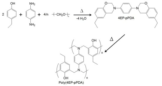 A new diamine-based benzoxazine (4EP-pPDA) was synthesized by the reaction of 4-ethylphenol, 1,4-phenylenediamine, and paraformaldehyde as shown in Scheme 1.