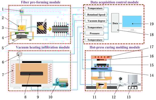 The key parts of the VIHPS are the four modules: fiber pre-forming module, vacuum heating infiltration module, hot-press curing molding module, and data acquisition control module. The fiber pre-forming module can realize the cutting of fibers, the preparation of mixed solutions, and the optimal design of fiber layup methods, so as to finally complete the preparation process of carbon fiber preforms. The vacuum heating infiltration module can effectively reduce the air bubbles inside the fiber preform by enhancing the fluidity of the resin in the fiber under a high-temperature and negative-pressure environment, thereby achieving sufficient infiltration. The hot-press curing molding module can achieve the final complete infiltration and curing of the composite material under the action of extrusion force and higher temperature. The data acquisition control module can monitor and control the changes of key process parameter values in the process of composite material preparation in real time. The four module devices are reasonably distributed and work together to form a complete VIHPS.