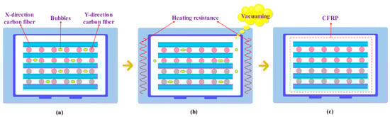 Therefore, after the fiber preform is prepared, the vacuum heating infiltration module is added to provide the degree of vacuum and temperature required for the matrix solution to infiltrate the reinforcing fiber, which can effectively improve the infiltration effect of the composite material. During the infiltration process, as shown in Figure 3a, in the initial state, the air bubbles inside the fiber preform are randomly distributed between the fibers. As shown in Figure 3b, when the vacuum heating infiltration module starts to work, a vacuum negative pressure is formed between the inside and the outside of the preform, and the internal bubbles gradually diffuse to the outer sides of the preform. At the same time, the higher temperature can improve the fluidity of the cured mixed solution in the fiber, so that the matrix solution is fully impregnated in the fiber preform. As shown in Figure 3c, defects such as bubbles and holes in the final material are effectively controlled, which reduces the possibility of cracks expanding in the material, thereby greatly improving the overall performance of the material. The vacuum heating infiltration module mainly includes an electric heating drying box, a vacuum pump, a parameter display instrument, etc. During the experiment, the module can provide a temperature range of 25–300 °C and a vacuum degree of −0.1–0 MPa.