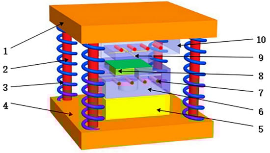 The basic principle is shown in Figure 4. The convex die 10 is always fixed at the upper layer. The hydraulic cylinder provides system power to push the concave die 6 at the lower end of the device upward to squeeze the composite material. After the extrusion of the composite material is completed, the concave die is restored to its initial working position by virtue of the gravity of the concave die and the restoring force of the four springs on the periphery of the device. There are heating holes 7 and thermocouple detection holes 9 on both sides of the concave–convex mold to realize the heating, thermal insulation, and temperature monitoring of the mold. The overall design and assembly structure diagram of the concave–convex mold is shown in Figure 4.