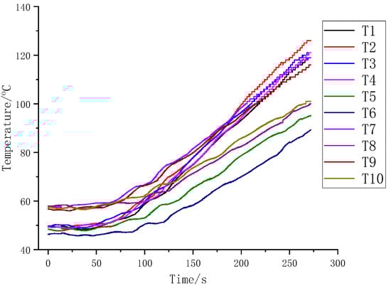 The variation curve of typical temperature parameters collected during the preparation process is shown in Figure 6. In order to monitor the temperature of the mold and make it evenly heated, 10 thermocouple detection holes at different positions and depths are set inside the upper and lower surfaces of the concave–convex mold to collect the temperature change of the mold in real time. In this way, the temperature of the mold is consistent with the surface temperature of the material, and the adverse effects of thermal mismatch of the material during the preparation process are eliminated. From the data collected in Figure 6, it can be known that the mold temperature can be increased from 50 °C to 130 °C in about 250 s, which ensures that the test process is stable, reliable, and fast.