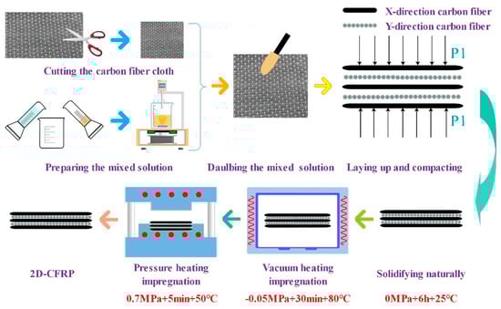 The specific process incorporated five steps. Firstly, the T700 carbon fiber cloth was cut into (60 mm × 60 mm) square pieces, the epoxy resin and the curing agent were mixed at a mass ratio of 4:1, and the mixture was placed in an electromagnetic stirrer to stir it uniformly. Secondly, the prepared curing mixed solution was applied evenly on both sides of the cut carbon fiber cloth, and then stacked in order; the angle between adjacent fiber layers was 90°, and certain pressure was applied to pre-compact the layers. Thirdly, the prepared carbon fiber laminate was cured at 25 °C for 6 h, and then transferred to the vacuum heating infiltration module, where the degree of vacuum was −0.05 MPa, the curing time was 30 min, and the temperature was 80 °C. Fourthly, the carbon fiber laminate was removed and placed it into the hot-press curing molding module, where the extrusion force was 0.7 MPa, the holding time was 5 min, and the temperature was 50 °C. Lastly, the heating and pressing process was stopped, and, once the mold returned to room temperature, the prepared 2D-CFRP composite material was removed. The main process parameters for preparing the 2D-CFRP composite material by VIHPS are shown in Table 3, and a schematic diagram of the process flow is shown in Figure 8.