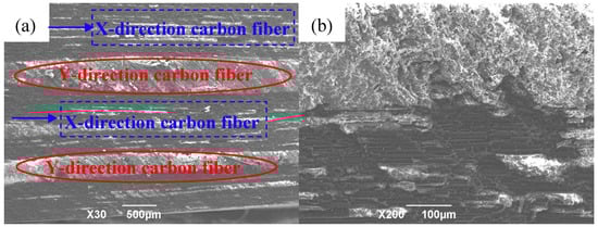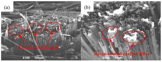 The bending fracture morphology of the prepared CFRP composite was observed, as shown in Figure 11a. The breaking and pulling out of fibers in the fracture of the composite material indicated that the resin was fully infiltrated between the carbon fibers and the two were tightly combined. When the magnification was further increased, as shown in Figure 11b, it can be found that the resin was coated inside and between the carbon fiber bundles, while also reflecting that the material’s infiltration effect was indeed greatly improved. Furthermore, it can be seen that the vacuum infiltration hot-press forming process method could be applied to the preparation of CFRP. The proposal of VIHPS enriches the preparation process system of CFRP and provides experience for the promotion and engineering application of CFRP composite materials.