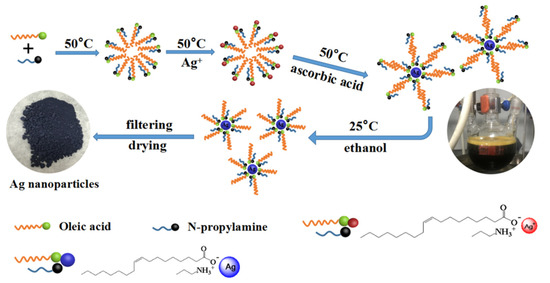 The AgNO3 (3.397 g of AgNO3 dissolved in 200 mL of deionized water), oleic acid (25 mL) and n-propylamine (75 mL) were stirred at a high speed in a 500 mL three-necked flask at 50 °C for 1 h [23]. Then, ascorbic acid solution (7.045 g of ascorbic acid dissolved in 50 mL of deionized water) was added. The mixture was held at 50 °C and stirred for 3 h, and a dark brown organic Ag nanoparticle colloidal solution was obtained. After that, ethanol (500 mL) was added into the solution to precipitate the crude Ag nanoparticles. Finally, the precipitate was isolated by filtration, washed twice with acetone and vacuum-dried at 50 °C for 48 h to afford the final products in the form of blue powders. Synthesis procedure of Ag nanoparticles is shown in Figure 1.
