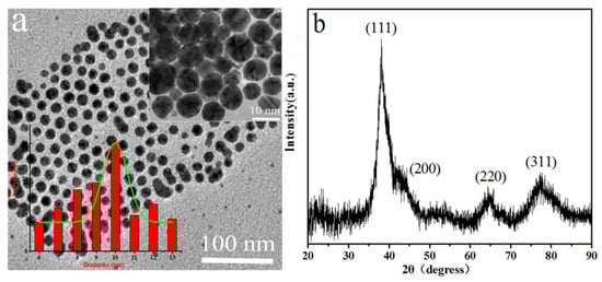 (a) TEM images of the as-synthesized Ag nanoparticles and the corresponding size distribution of as-synthesized Ag nanoparticles (inset); (b) XRD pattern of as-synthesized Ag nanoparticles.