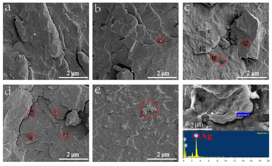 SEM images of polyoxymethylene (POM)/Ag nanocomposites with different Ag nanoparticle contents: (a) 0, (b) 0.1, (c) 0.5, (d) 1 and (e) 2 wt % (The red circles indicate Ag nanoparticles). (f) EDS results obtained at region.